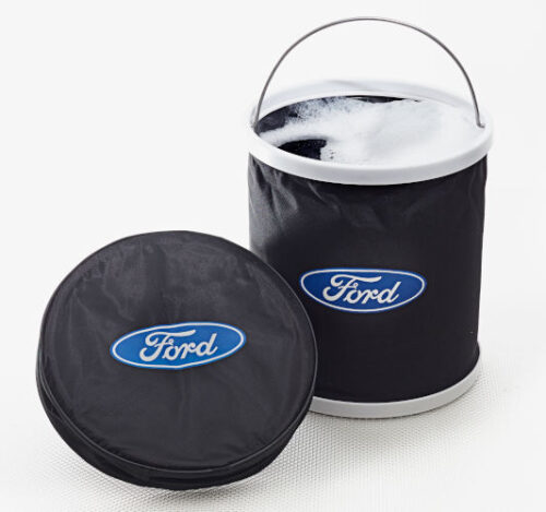 Space-saving collapsible bucket with Ford logo and ventilated storage case. Will fold down flat when not in use.