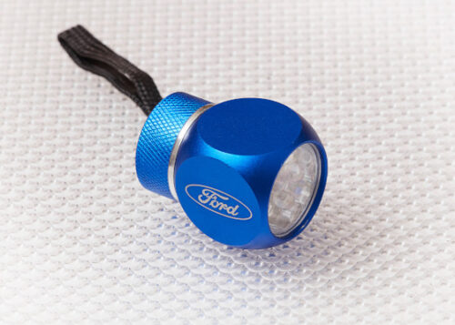 Blue aluminium cube car torch with 6 LED bulbs and Ford logo. This handy and compact torch can be stored in glovebox or door pocket in your car, van or pickup truck.